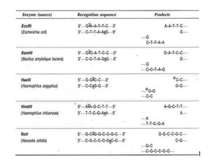 This document summarizes various tools used in genetic engineering. It describes restriction enzymes like EcoRI and HinDIII that cut DNA at specific sequences. It also discusses DNA ligases that join DNA fragments and alkaline phosphatase which removes phosphates to prevent unwanted ligation. Common vectors like plasmids, bacteriophages, cosmids, BACs and YACs are outlined which allow insertion of exogenous DNA for storage and manipulation. Larger fragments can be accommodated by vectors like YACs and BACs.