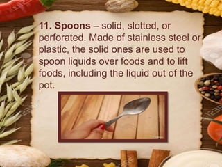 The document discusses various tools, equipment, and utensils needed for preparing desserts and sweets. It describes spoons, temperature scales, vegetable peelers, whisks, wooden spoons, and baking pans as essential tools. It also lists refrigerators/freezers, ranges, mixers, and blenders as key pieces of equipment used for more complicated tasks like mixing, blending, and cooking food items.