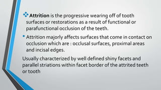 Tooth attrition is the gradual wear of tooth surfaces due to functional or parafunctional occlusion, affecting areas such as occlusal surfaces and incisal edges. It can be categorized into physiological attrition, occurring with normal aging, and pathological attrition, resulting from abnormal chewing habits or structural defects, which may cause pain and sensitivity. Factors influencing attrition include bruxism and exposure to abrasive substances, both of which can also increase the risk of dental caries.