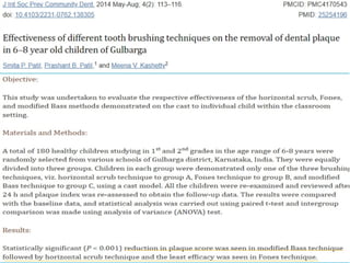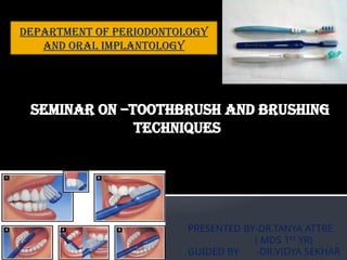 The document presents a seminar by Dr. Tanya Attre on toothbrushes and brushing techniques, aiming to educate on dental plaque, the history of toothbrushes, types, and brushing methods. It covers the objectives of tooth brushing, various techniques, including the Bass and Modified Bass methods, and advancements in toothbrush technology, such as sonic and ionic toothbrushes. The conclusion emphasizes that effective plaque control is best achieved through proper motivation and instruction in toothbrush usage.