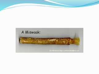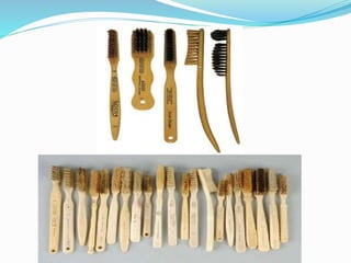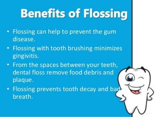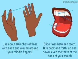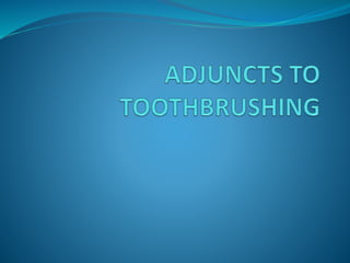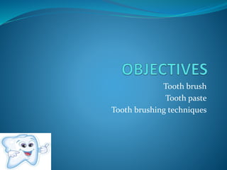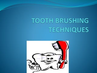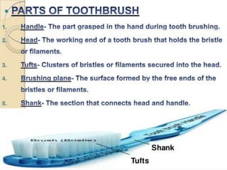 This document provides information on proper tooth brushing techniques. It discusses the components of a toothbrush, ideal brush properties, brush designs including manual and electric options. It covers different brushing techniques like Stillman and Bass methods. The roles of toothpaste, floss, and other aids are outlined. Recommendations are provided for brushing techniques based on location, like occlusal surfaces and the tongue. Mouth rinsing after brushing is emphasized for its role in removing debris.