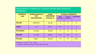 The document discusses various tooth-colored restorative materials, their historical development, and ideal requirements for effective dental applications. It details types of composites, including filled resin and their components, while emphasizing mechanical properties, bonding to tooth structure, and the importance of reducing polymerization shrinkage. Additionally, advancements in material technology, such as siloranes and antibacterial composites, are highlighted as significant improvements in dental restorative practices.