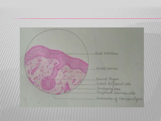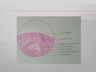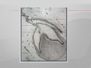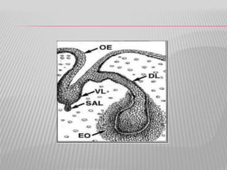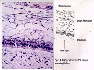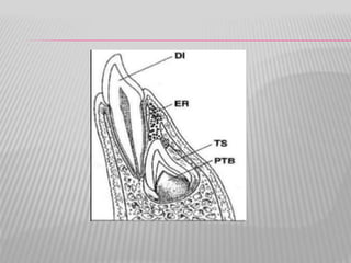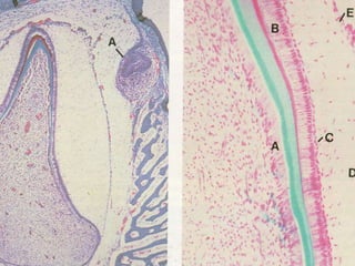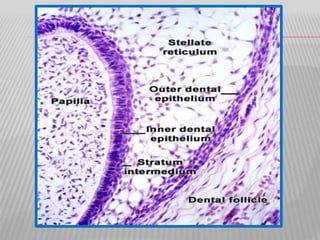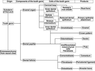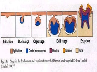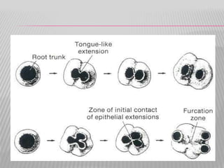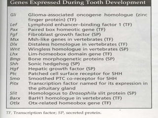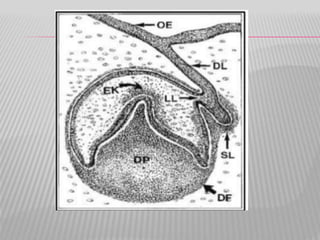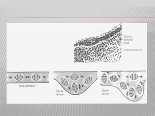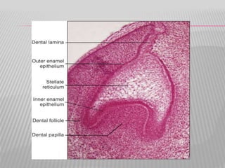 The document summarizes the development of teeth from the initial formation of the primary epithelial band and dental lamina through the bud, cap and bell stages. It describes how the enamel organ and surrounding dental papilla and sac develop during these stages. Key stages of root formation controlled by Hertwig's epithelial root sheath are also outlined. The timeline of human tooth development from 6 weeks gestation through adulthood is provided. Molecular insights regarding signaling pathways such as FGF, SHH and BMPs controlling tooth morphogenesis and patterning are discussed.