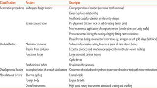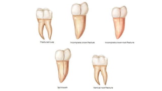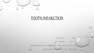 Tooth infarction, also known as cracked tooth syndrome, refers to an incomplete tooth fracture extending partially through the tooth. It can occur in the crown, originating from the pulp towards the dentinoenamel junction or propagating apically in the root. Symptoms include pain upon chewing or with temperature changes. Diagnosis involves visual examination, transillumination, staining with methylene blue dye, biting tests, and occasionally radiography. Treatment depends on factors like fracture location and pulp involvement.