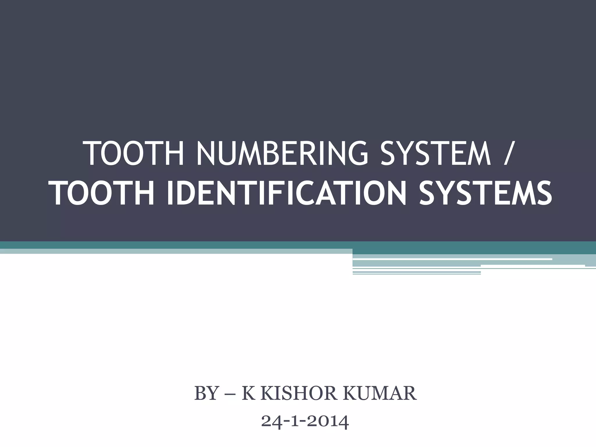 The document discusses various tooth numbering systems used by dentists for tooth identification and data recording, highlighting the necessity of shorthand notation in clinical practice. It outlines three main systems: the Universal Notation System, Zsigmondy/Palmer Notation System, and the Federation Dentaire Internationale (FDI) system, each with specific methods for identifying primary and permanent teeth. The document details how each system categorizes teeth based on quadrants and assigns codes or numbers to each tooth.