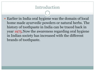 The document provides an analysis of the toothpaste industry in India. It discusses the key players in the industry including Colgate, HUL, and Dabur.