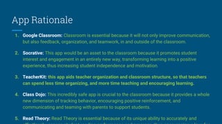 The document summarizes 10 popular apps for teaching and learning. It provides the name of each app and a brief rationale for its selection focusing on benefits like improved communication, engagement, assessment, and collaboration. Key apps include Google Classroom for organization, Socrative and Kahoot! for interactive lessons, Plickers and Nearpod for assessments without devices, and Brainpop, Seesaw and Read Theory for content and student portfolios. Overall, the apps aim to enhance learning, participation, and feedback in fun, engaging ways.