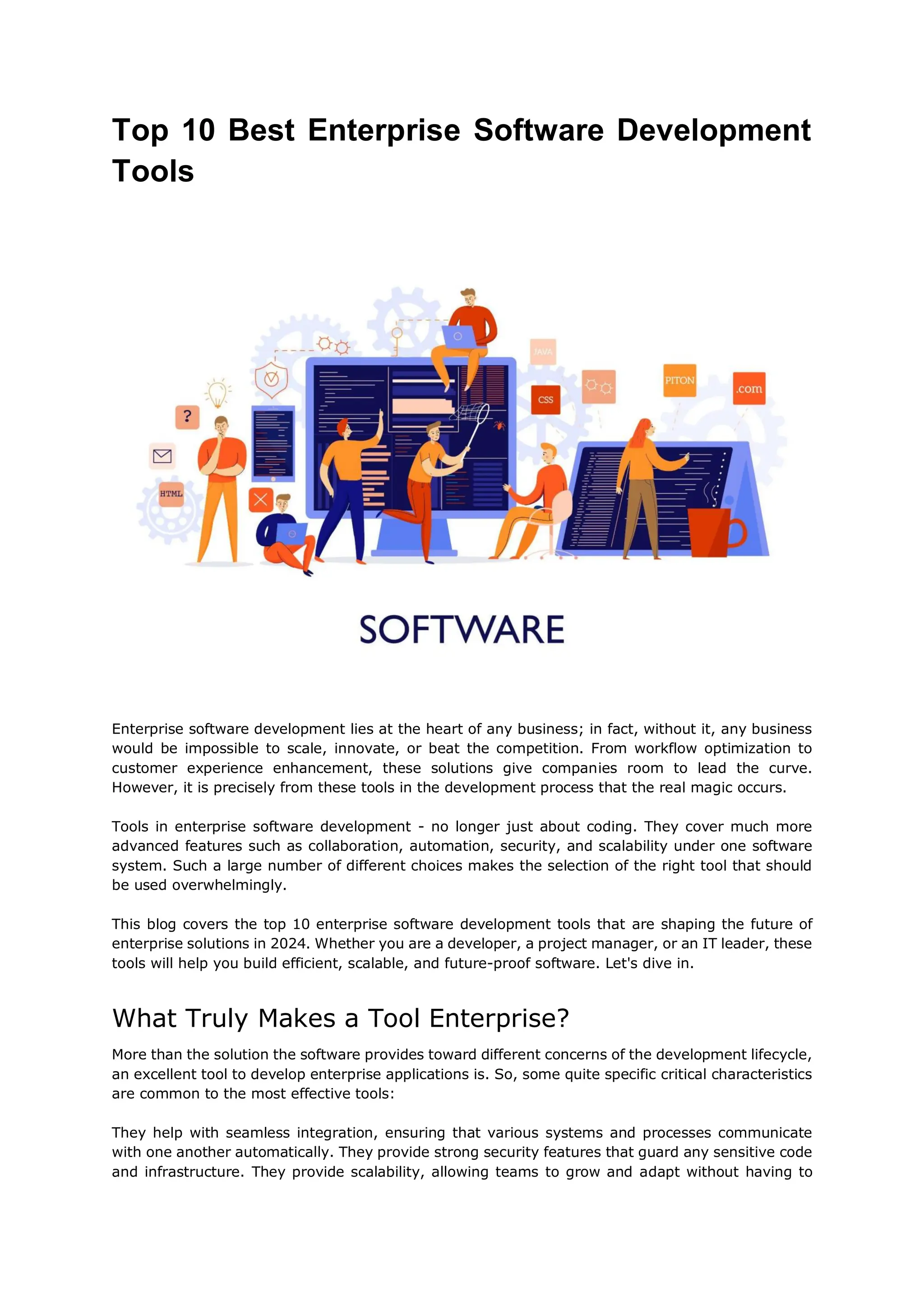 The document outlines the importance of enterprise software development tools for businesses, highlighting their roles in scalability, innovation, and competition. It features the top 10 tools for 2024, including Visual Studio Code, Jenkins, Docker, and others, detailing their functionalities and benefits. The emphasis is on choosing the right tools tailored to organizational needs for effective software development.