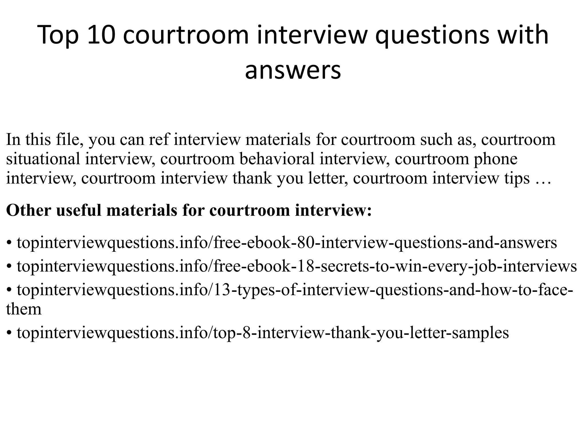 This document provides materials and guidance for courtroom interview questions and preparation. It includes top interview questions with sample answers, tips for courtroom interviews, and links to additional interview resources. Some key tips include doing research on the company and position, making a strong first impression, practicing interview skills, having good questions prepared, and following up with a thank you note after the interview. A variety of common interview questions are provided with suggestions for effective responses.
