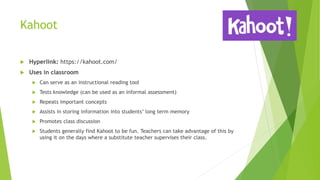 The document provides a review of the top 10 educational apps for use in K-12 classrooms. It summarizes the features and uses of apps such as Kahoot, Google Classroom, YouTube, Quizlet, Khan Academy, ABCYa, BrainPOP Jr., and Epic Books. For each app, the summary addresses how it connects to curriculum standards, provides feedback, encourages higher-order thinking skills, is intuitive for students to use, and offers privacy protections. Most of the reviewed apps were found to directly align with curriculum, immediately score student work, and be easy for students to independently navigate.