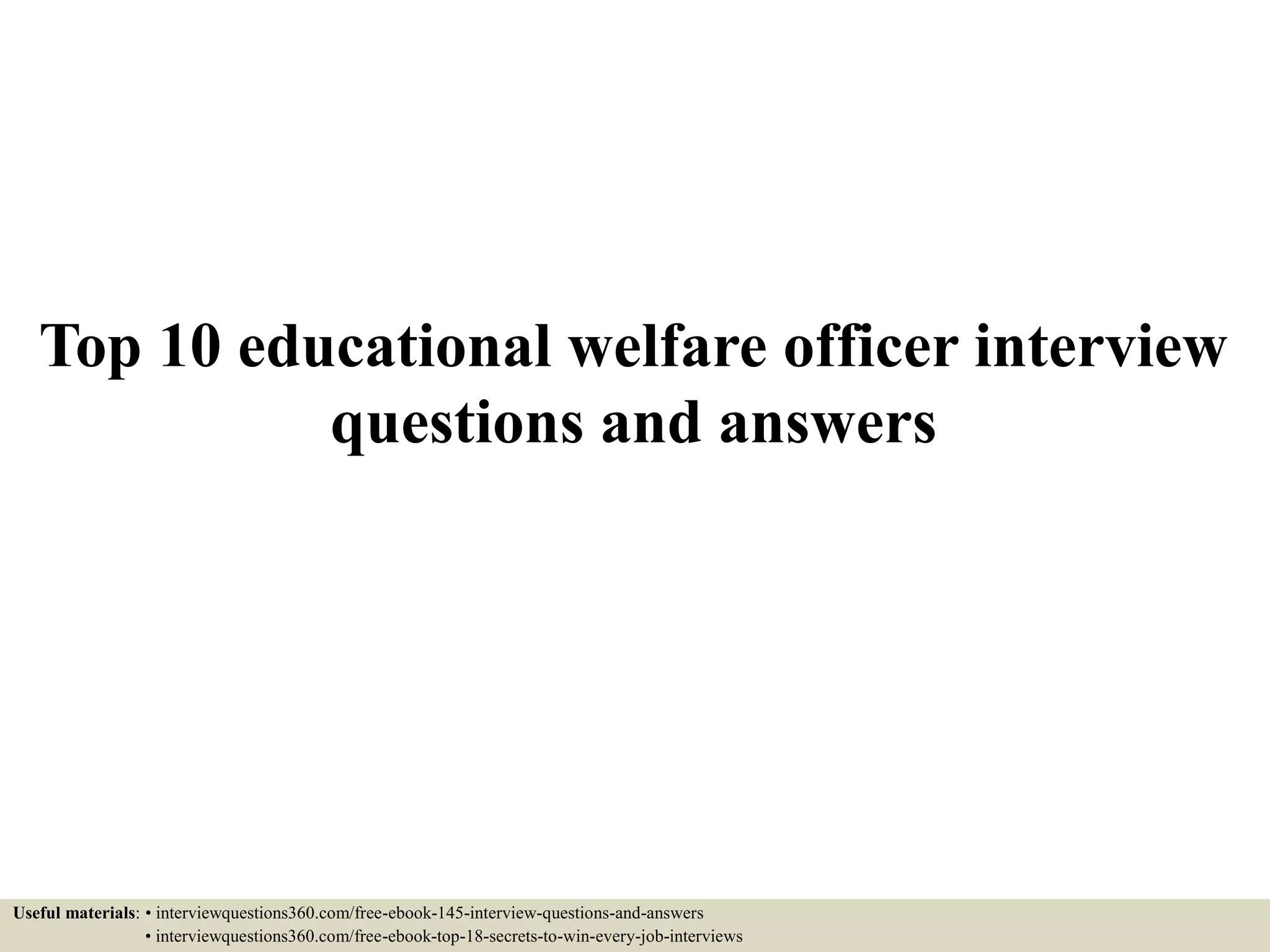 This document provides materials and advice for interviewing for an educational welfare officer position, including sample answers to common interview questions. It lists 10 frequently asked questions for this role, such as "Why do you want this job?", "What have you learned from mistakes?", and "Why should we hire you?". For each question, it provides a paragraph of guidance on an effective answer that highlights relevant experience and passion for the role and organization. The document aims to help candidates prepare compelling responses that will impress interviewers.