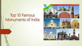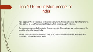 India is renowned for its historical monuments, which reflect its rich cultural heritage and architectural brilliance. The document lists the top ten famous Indian monuments, including the Taj Mahal, Qutub Minar, and India Gate, each accompanied by brief descriptions of their significance and history. These monuments are essential topics for general knowledge and government exams.