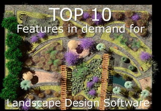 The document outlines the top 10 features required for landscape design software, highlighting the most requested capabilities in professional forums and their importance to landscape designers and urban planners. Key features include professional results, ease of use, full functionality in 2D/3D, a comprehensive plants database, and realistic rendering capabilities. Lands Design, integrated with Rhino, provides a cost-effective option with regular updates and extensive documentation tools for professionals in the field.