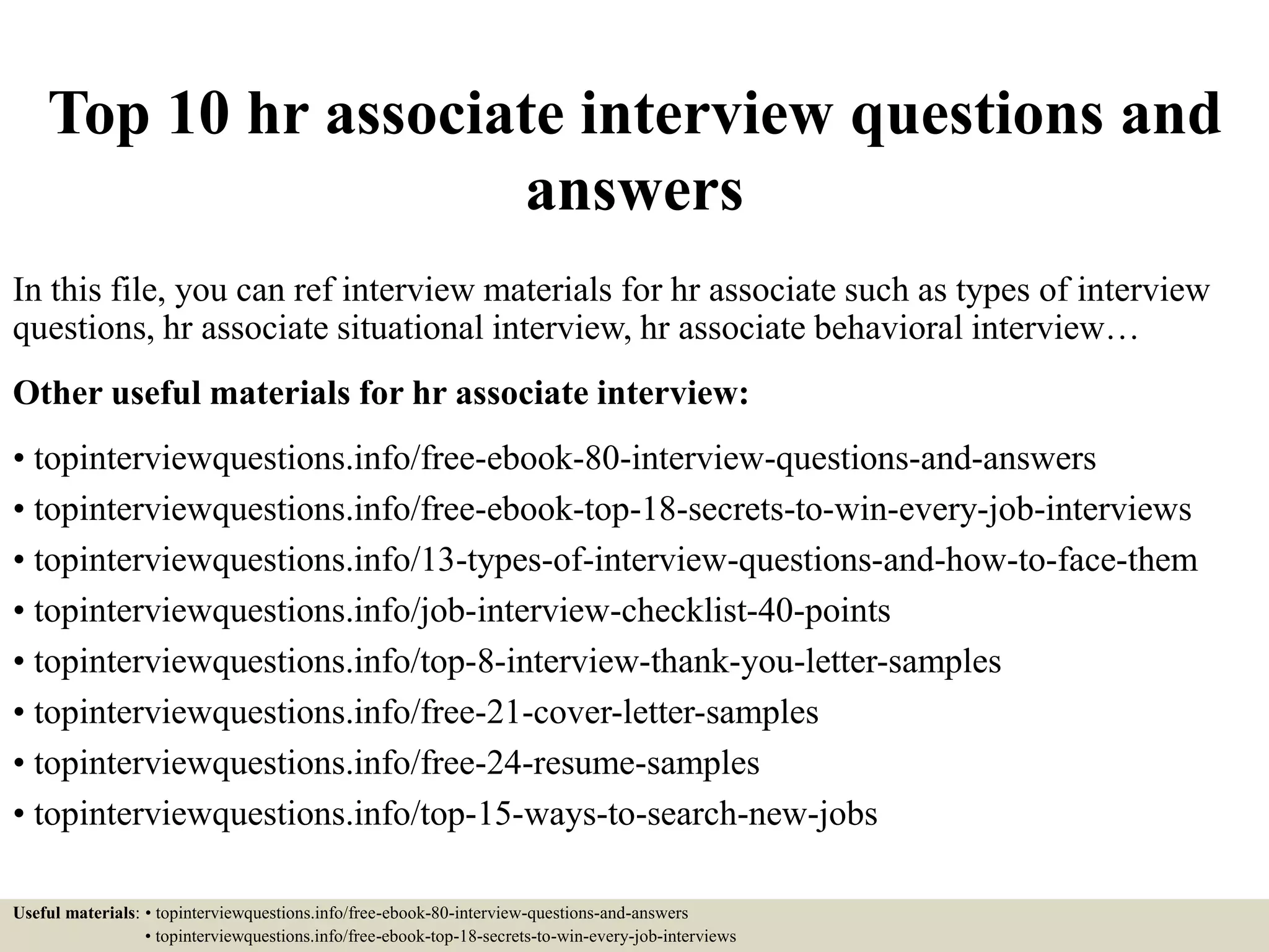 This document provides information and advice about common interview questions for HR associate positions. It lists the top 10 interview questions, such as "Why do you want this job?" and "What challenges are you looking for?". For each question, it gives recommendations on how to effectively answer the question and highlights examples. Additional free resources on interview preparation are also listed.