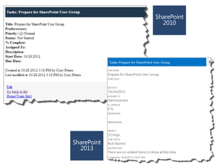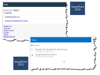 The document outlines key features and changes in SharePoint 2013, including the rebranding and reorganization of user profiles and social features. It also discusses improvements in mobile support, site permissions redesign, content search enhancements, and offline capabilities. Additional topics covered include app types, storage solutions, and system requirements for different devices.