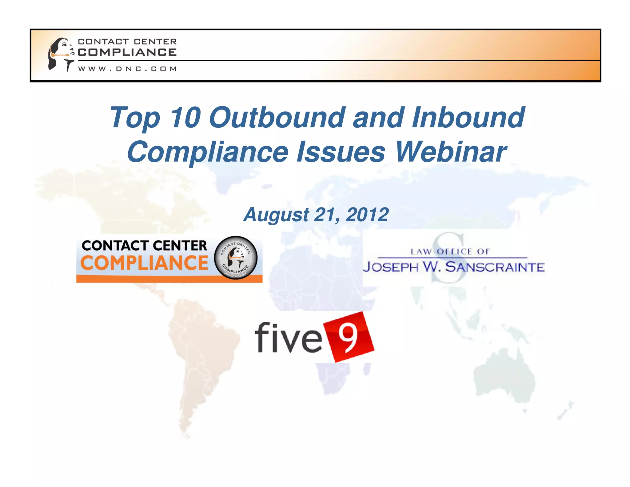 This document summarizes the top 10 outbound and inbound compliance issues discussed in a webinar. The issues included the FTC DNC registry data, new FCC rules on prerecorded messages and predictive dialers, safe harbor provisions, myths about inbound calling, preview dialing, a proposed public safety DNC list, and enforcement trends. The webinar provided an overview of the issues and took polls of participants to gauge use of different dialing strategies and perspectives on related compliance topics.