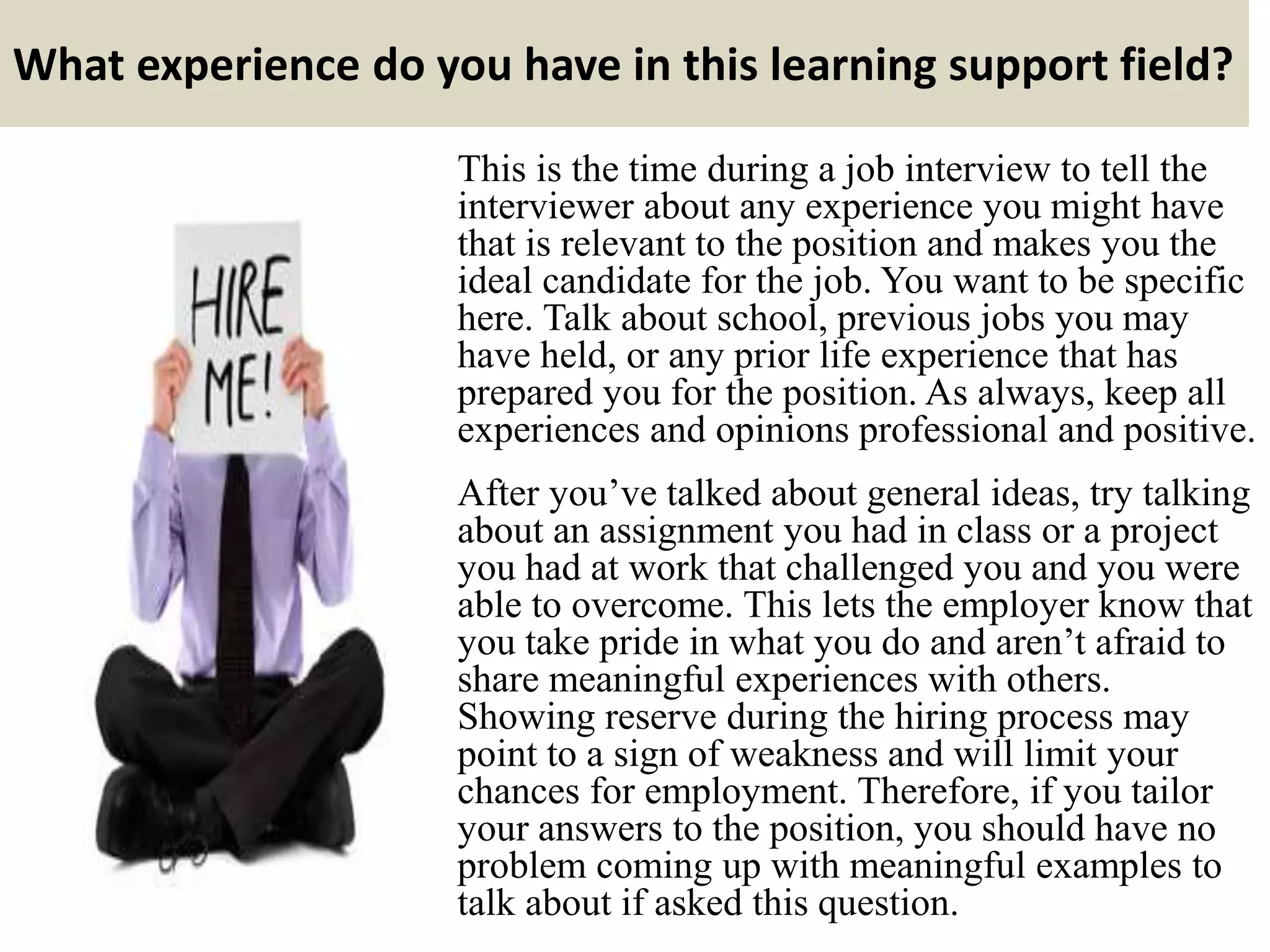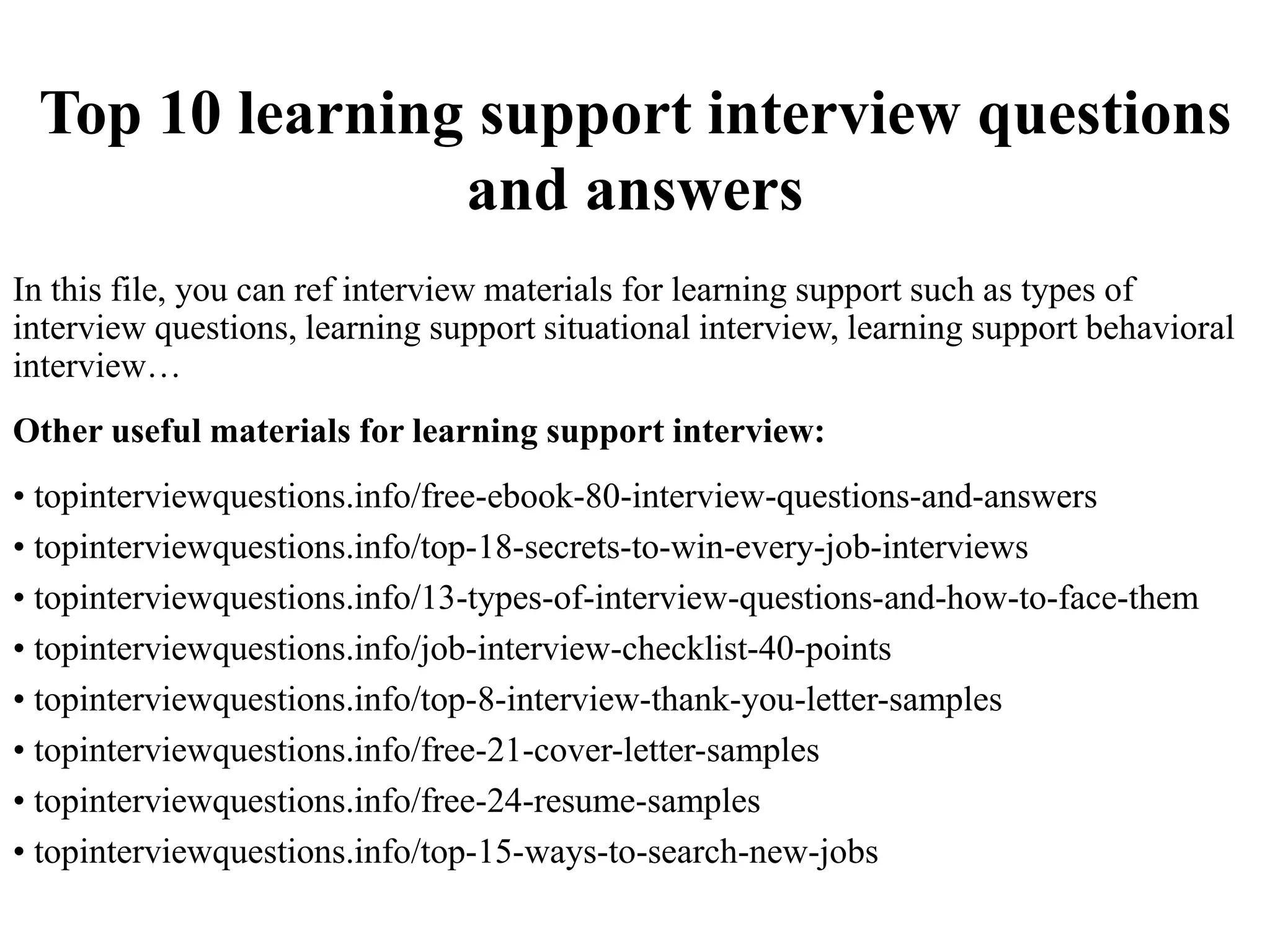 This document provides a list of useful materials for learning support interviews, including common interview questions, tips for answering questions, and sample follow-up emails. It includes links to resources on situational, behavioral, phone, and technical interview questions as well as tips for preparation, attire, strengths/weaknesses, and following up after an interview. The document aims to equip job applicants with knowledge on different interview types and strategies for making a strong impression.