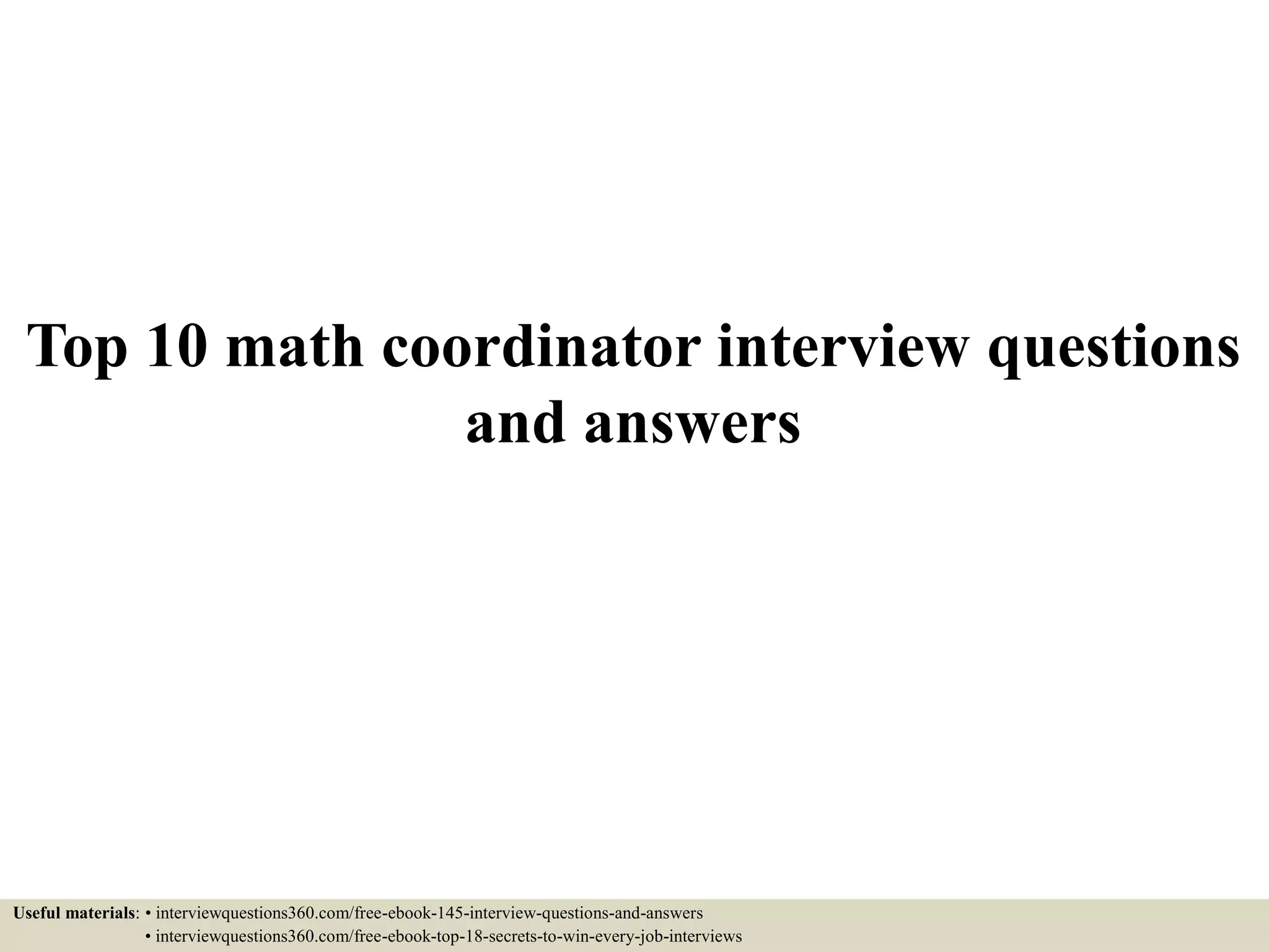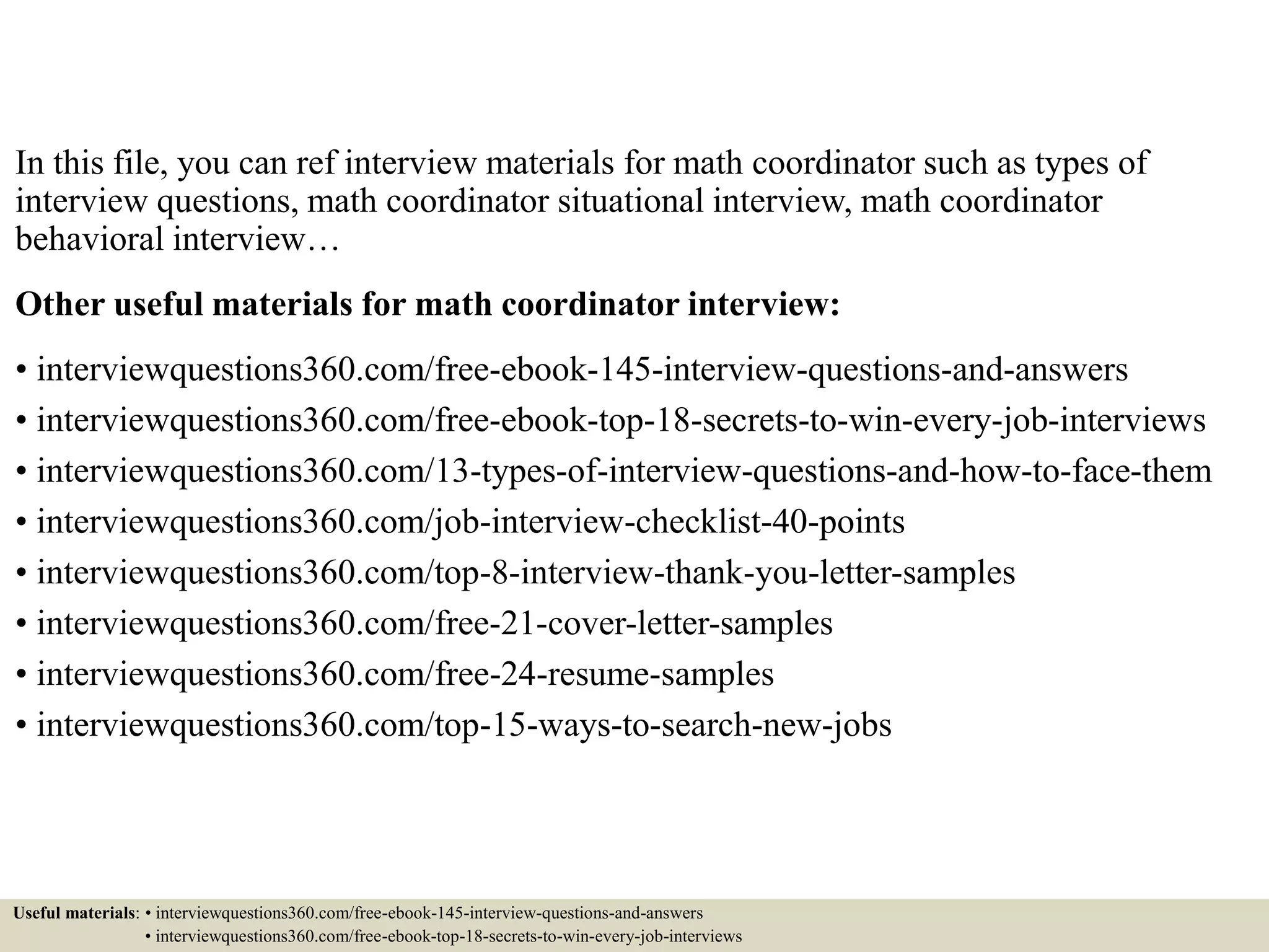 This document provides a comprehensive guide for candidates preparing for a math coordinator position interview, detailing the top 10 common interview questions along with recommended approaches to answer them. It includes links to various resources for interview preparation and highlights the importance of demonstrating knowledge about the company, articulating personal values, and showcasing relevant experiences. Additionally, it emphasizes the significance of understanding different types of interviews and following up with thank-you letters after the interview.