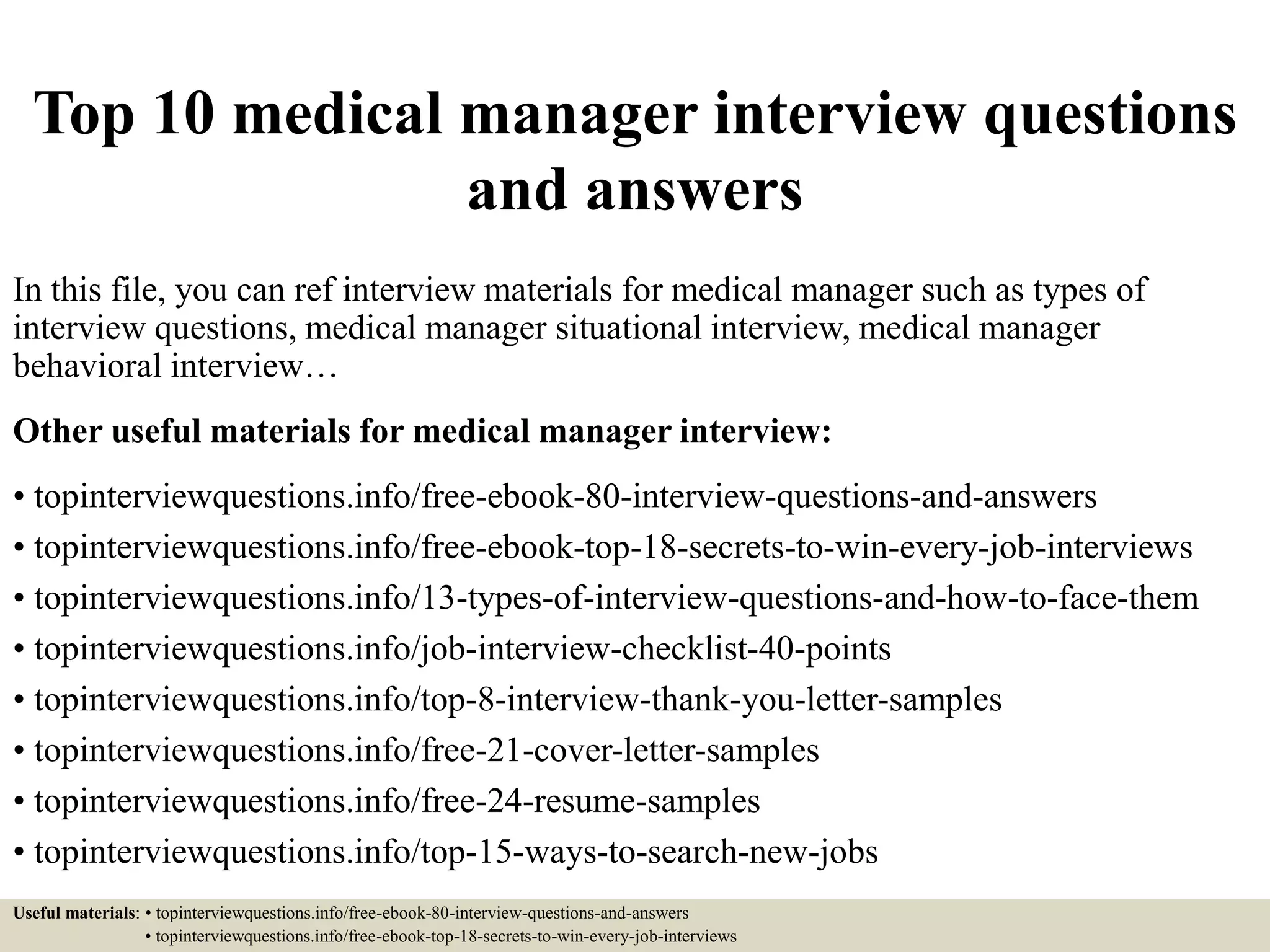 This document provides resources for medical manager interview preparation, including common interview questions, answers, and tips. It includes links to ebooks on interview questions and secrets to winning interviews. Sample questions cover why the applicant wants the job, lessons learned from mistakes, challenges they are seeking, and describing a typical work week. The document also provides additional materials on interview types, follow-up letters, career fields and job titles related to medical manager roles.