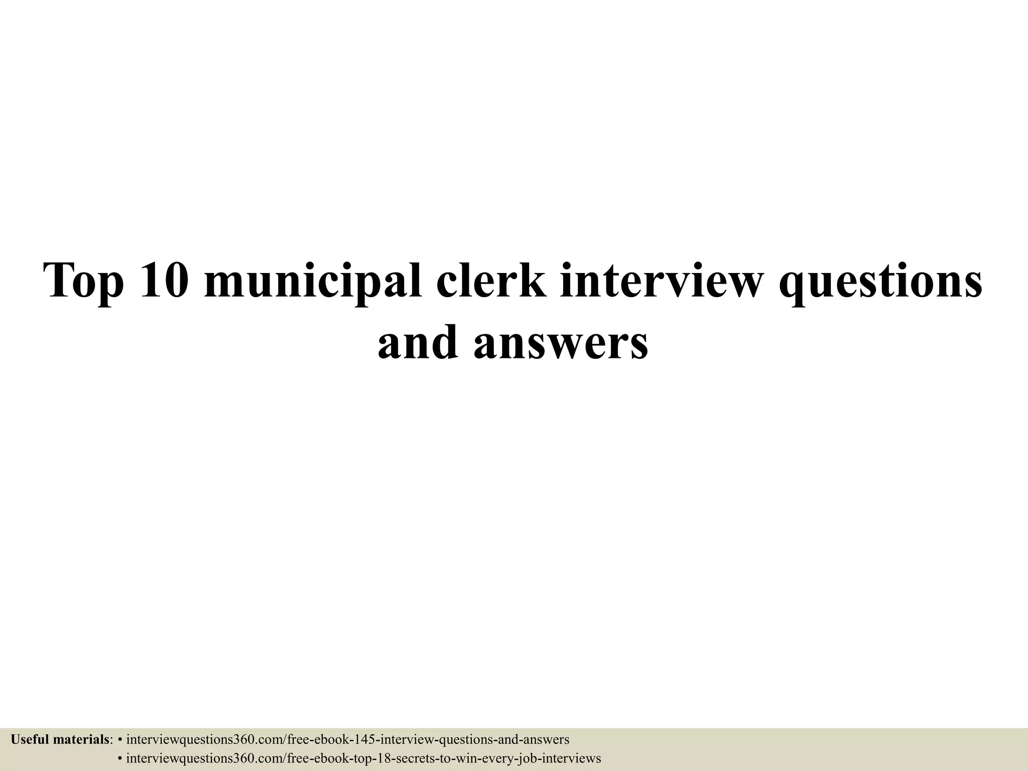The document provides resources for interview preparation for a municipal clerk position, including common interview questions, answers, and additional preparation materials. It lists 10 typical municipal clerk interview questions covering topics like reasons for interest in the role, learning from past mistakes, challenges sought, and describing a typical work week. For each question, it provides a sample answer. The document also provides additional links to ebooks and articles on interview skills and questions for a variety of related roles and levels.