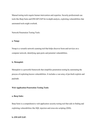 Penetration testing, or ethical hacking, is vital for securing digital systems by simulating cyber-attacks to identify vulnerabilities. Various tools are categorized as automated (like Nessus and OpenVAS) and manual (like Burp Suite and OWASP ZAP), each serving different purposes in assessing security. Staying updated on penetration testing tools is essential for effectively safeguarding against evolving cyber threats.