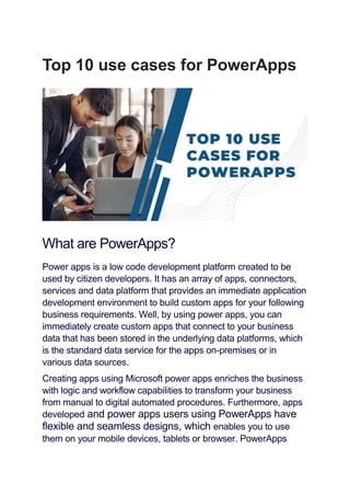 PowerApps is a low-code development platform that allows users to create custom applications tailored to their business needs without requiring extensive coding knowledge. It provides various app types, such as canvas apps, model-driven apps, and web portals, enabling flexible designs and seamless integration with other Microsoft tools. Key use cases include customized app creation, expense approvals, on-site inspections, and data handling, making it an effective solution for enhancing business processes and efficiency.