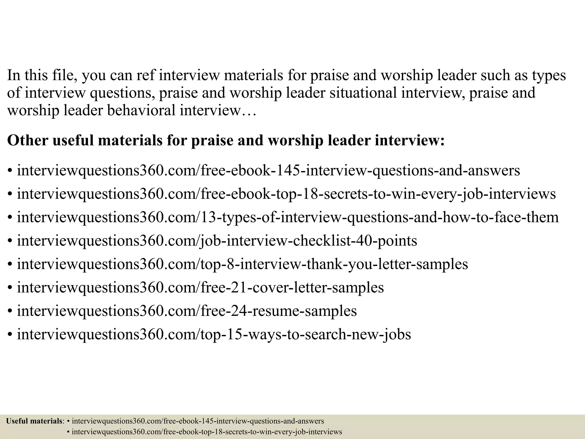 This document provides advice and sample answers for common interview questions for a praise and worship leader position. It discusses 10 typical interview questions, such as why the applicant wants the job, what challenges they are seeking, describing a typical work week, weaknesses, why the company should hire them, what they know about the company, and questions for the interviewer. The document emphasizes showing passion for the role, providing specific examples, highlighting relevant skills and experience, and researching the company thoroughly.