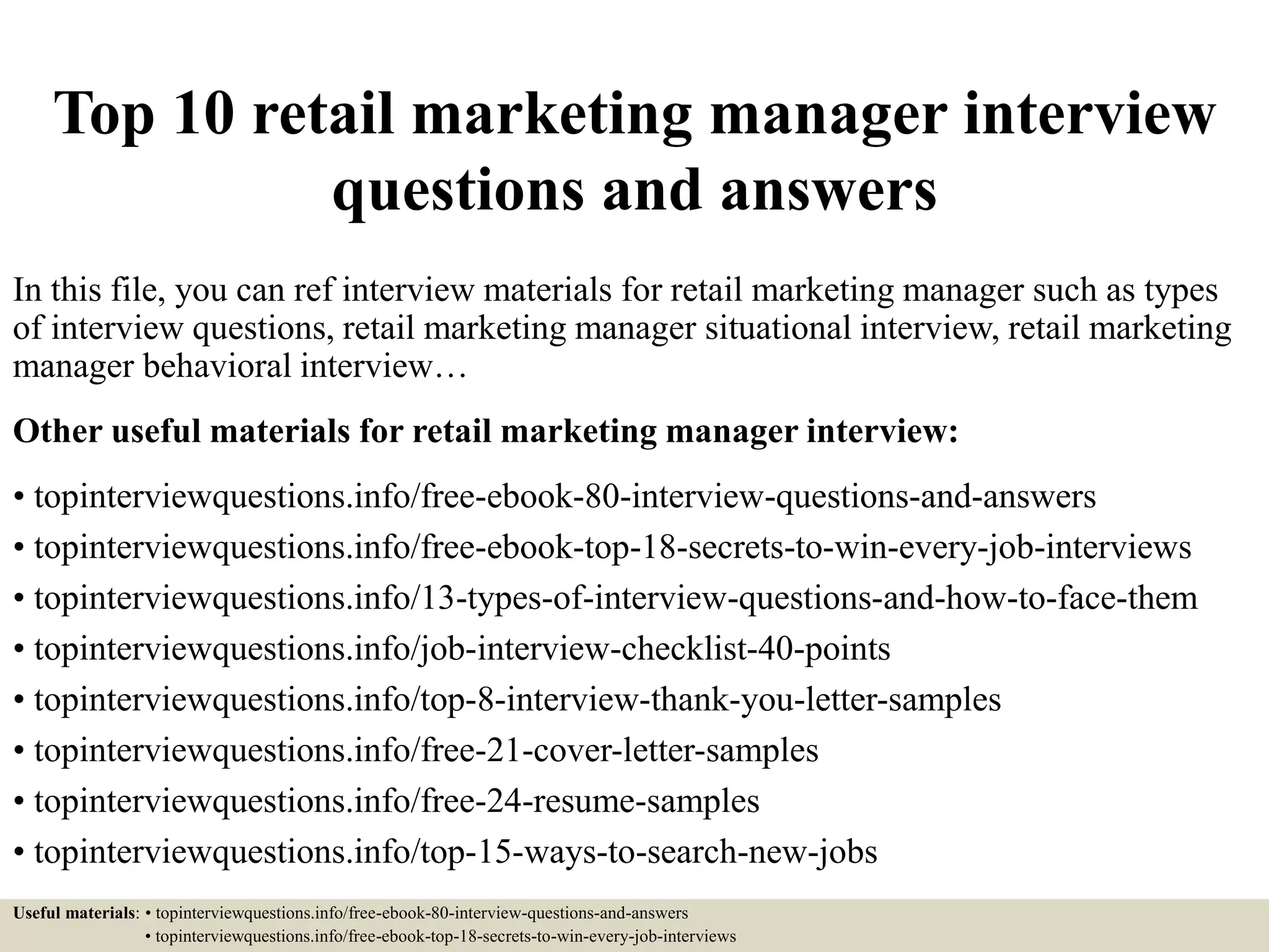 This document provides information and resources to help prepare for an interview for a retail marketing manager position. It includes sample answers to common interview questions, such as why the applicant wants the job, what challenges they are looking for, and what they know about the company. It also provides links to additional free ebooks and resources on interview preparation.