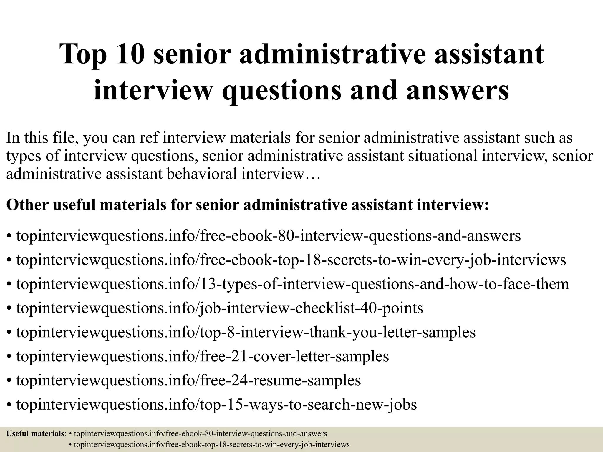 This document provides resources for preparing for a senior administrative assistant interview, including common interview questions, examples of thank you letters, resume and cover letter samples. It lists top interview questions and answers on topics like why the applicant wants the job, challenges they seek, describing a typical work week, weaknesses, and questions to ask the employer. Useful materials are provided such as ebooks on interview questions, secrets to winning interviews, and tips for different types of interviews. A variety of fields that could require these interview skills for a senior administrative assistant are also listed.