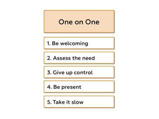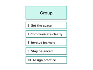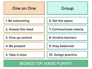 The document outlines ten essential skills for teaching technology to library patrons, emphasizing the importance of interpersonal communication, learner engagement, and adaptable teaching techniques. Key methods include creating a welcoming environment, assessing individual needs, fostering hands-on practice, and ensuring clear communication. It also highlights the significance of balancing structure with flexibility, involving learners actively, and maintaining an enjoyable atmosphere during instruction.