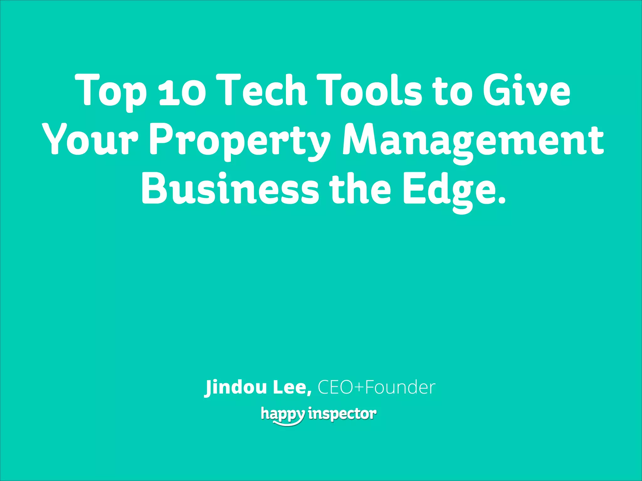 The document lists the top 10 technology tools for enhancing property management businesses, as presented by Jindou Lee, CEO and founder. Each tool is accompanied by its URL for more information. The tools mentioned include Rapportive, Yesware, HelloSign, Followup.cc, Picmarkr, 1Password, Basecamp, Contactually, Pay Near Me, and Happy Inspector.