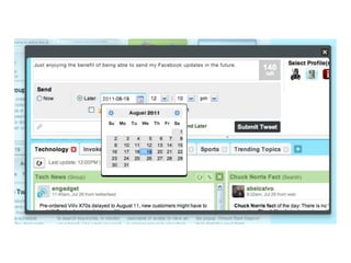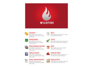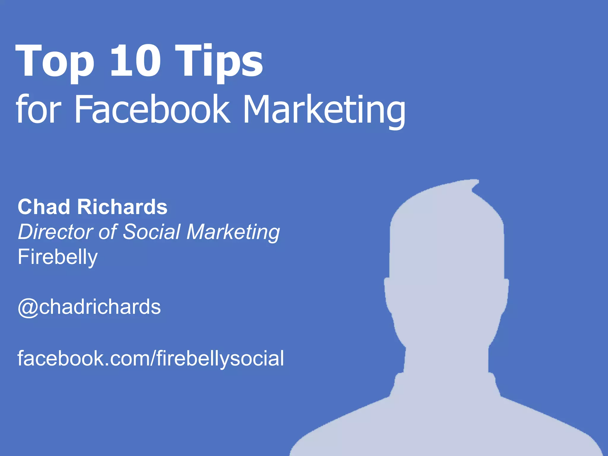 The document provides 10 tips for Facebook marketing from Chad Richards, Director of Social Marketing at Firebelly. The tips include using pages instead of profiles, promoting your page offline, using Facebook ads, creating landing tabs, offering discounts and deals, running contests and sweepstakes, using profile image billboards, sharing videos, using insights to make data-driven decisions, and setting up Facebook places check-in offers. Additional tips include using Facebook social plugins and social media management systems.