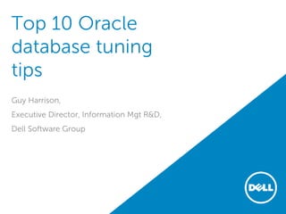 This document provides a summary of Guy Harrison's top 10 Oracle database tuning tips presentation. The tips include being methodical and empirical in tuning, optimizing database design, indexing wisely, writing efficient code, optimizing the optimizer, tuning SQL and PL/SQL, monitoring and managing contention, optimizing memory to reduce I/O, and tuning I/O last but tuning it well. The document discusses each tip in more detail and provides examples and best practices for implementing them.