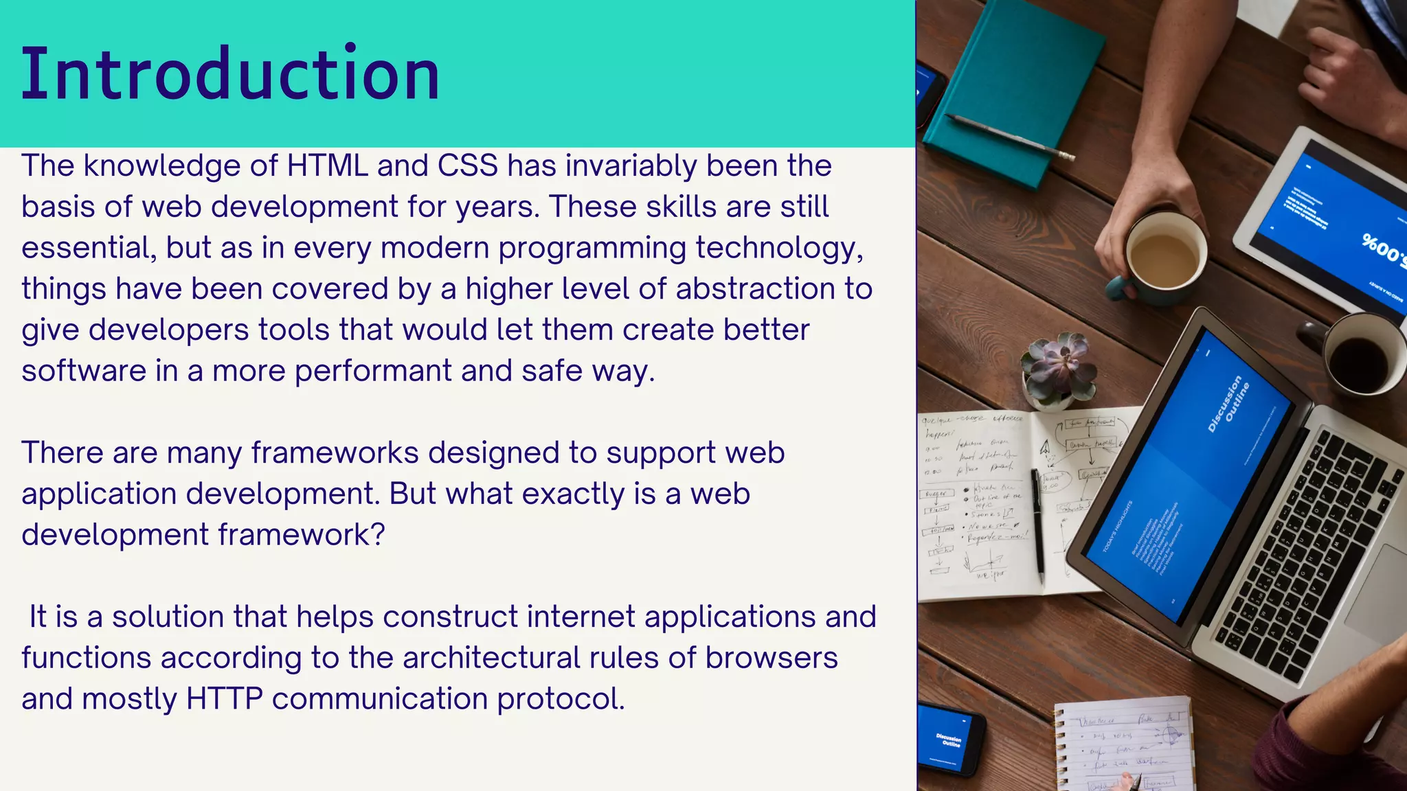 The document discusses the top 10 web development frameworks for 2022, emphasizing the evolution of web development beyond basic HTML and CSS to include frameworks that enhance performance and safety. It highlights popular frameworks like React, Vue.js, Angular, and Express, noting their usage statistics and advantages in constructing web applications. The document also stresses the importance of professional web design services for creating appealing and effective websites.