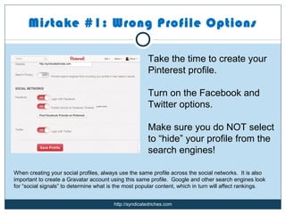 The document outlines the top 10 mistakes people make when using Pinterest. These include: 1) Not properly setting up your profile and connecting social accounts; 2) Overly promoting yourself without building relationships; 3) Posting inappropriate images; 4) Not crediting sources; 5) Scraping copyrighted content; 6) Losing focus by having multiple unrelated boards; 7) Not using keywords; 8) Not using hashtags; 9) Ignoring what's popular; and 10) Not having a clear strategy for your boards and pins. The document emphasizes building relationships, proper attribution, avoiding copyright issues, focusing your content, and researching trends.