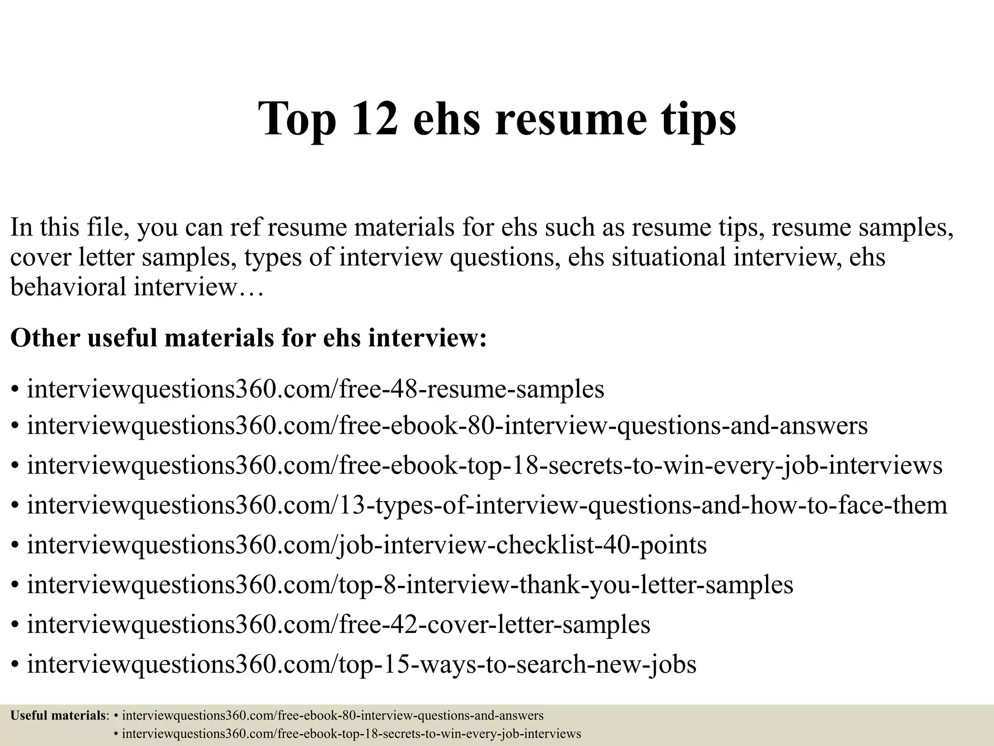The document provides resources for environmental health and safety (EHS) resumes, interviews, and career development. It lists resume tips, cover letter samples, types of interview questions, and links to eBooks and articles on topics like answering common interview questions, preparing for different interview types, negotiating salary, and developing one's career path. The resources provided are intended to help EHS professionals craft effective resumes and interviews for job applications and advancement.