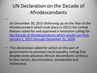 The document discusses several significant events related to afrodescendants and racial equality from 2013 to 2014, including the UN's declaration of the decade of afrodescendants and the tribute to Nelson Mandela. It highlights activism in Latin America, such as the celebration of national days for afro-Argentinians and Afro-Mexicans, and the establishment of a festival for Afrolatino cultures in New York. Additionally, it mentions key conferences and legal rulings regarding racial equality and the challenges faced by black communities in various countries.