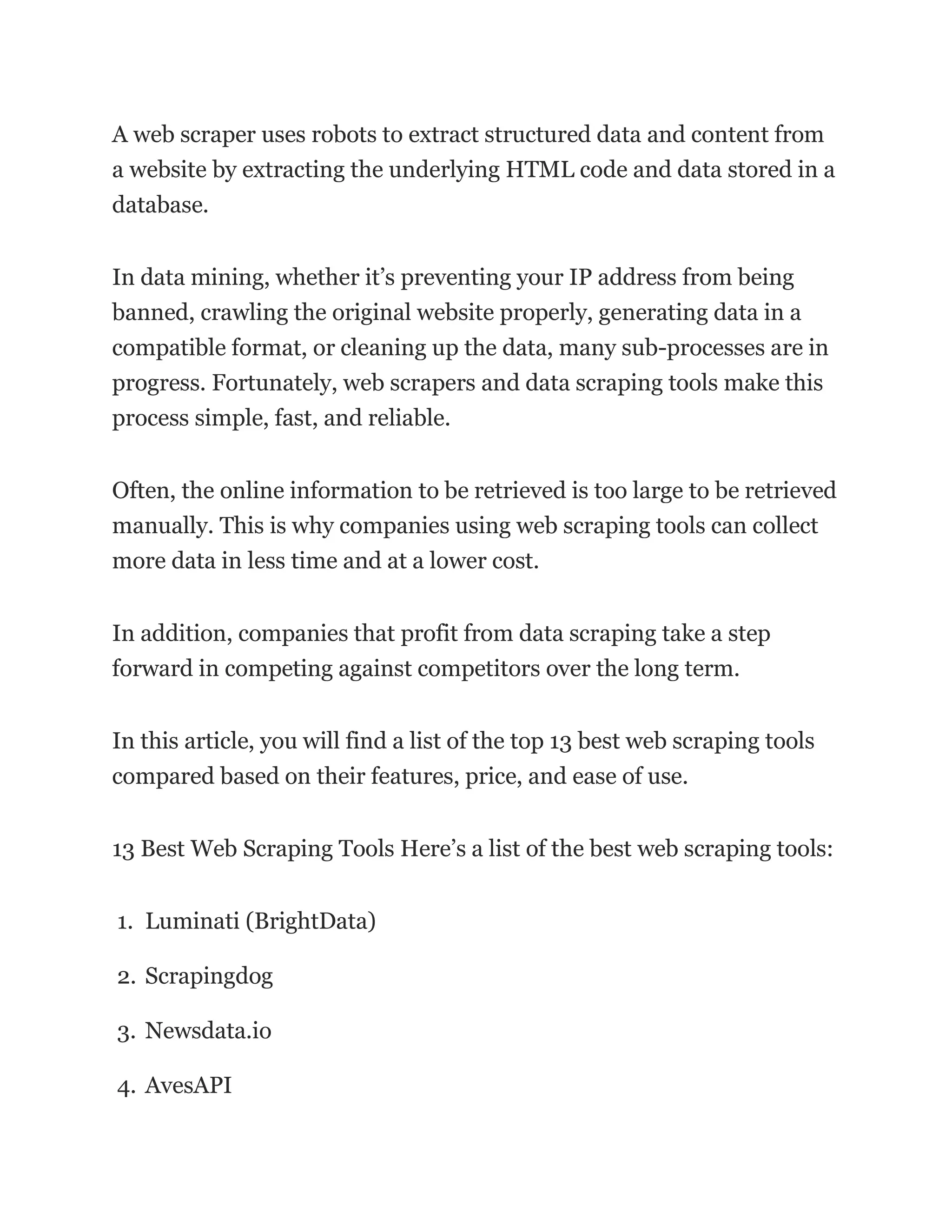 The document discusses and compares 13 of the top web scraping tools. It provides details on the features, pricing, and ease of use for each tool. Some of the top tools mentioned include Scrape.do, Scrapingdog, Newsdata.io, AvesAPI, ParseHub, Diffbot, Octoparse, ScrapingBee, BrightData, Grepsr, Scraper API, Scrapy, and Import.io. Web scraping tools allow users to extract structured data and content from websites in an automated manner.