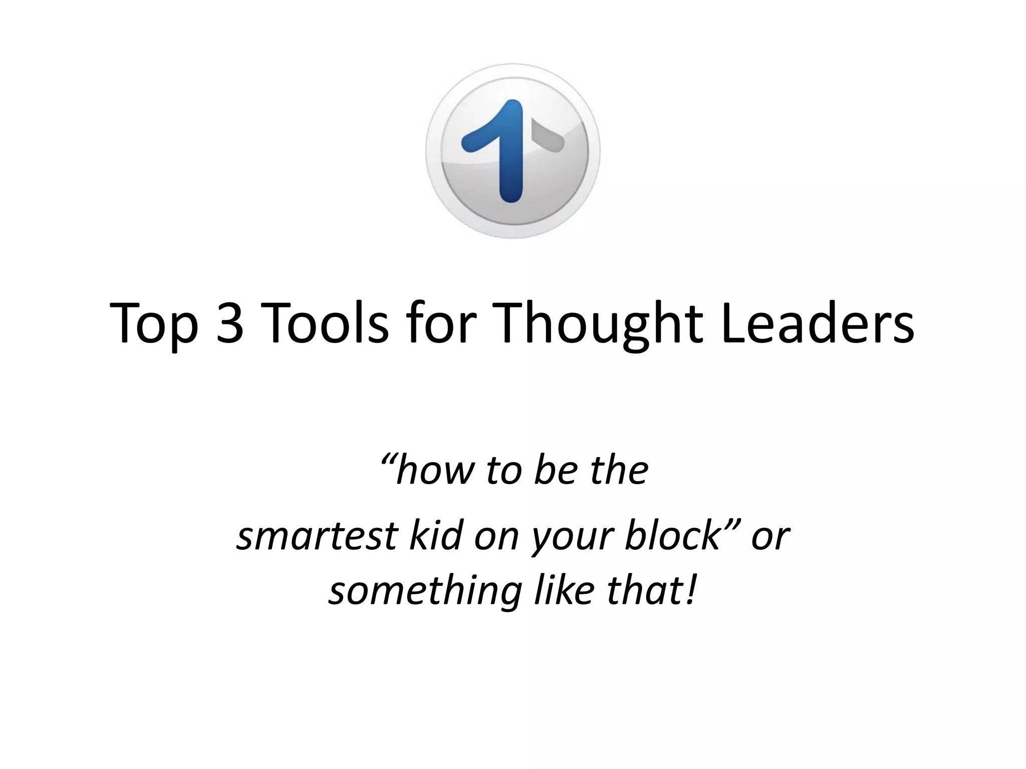 The document discusses the top 3 tools for thought leaders to use: 1) Google Reader for aggregating content from trusted sources and recommendations through RSS feeds, 2) following smart people on social media and sharing good content, and 3) the website E1evation.com to get a voice and spread ideas. The key is listening to trusted sources and leveraging people to get better results than going it alone. Google Reader tips include adding subscriptions, browsing recommendations, and creating feeds from alerts and searches.