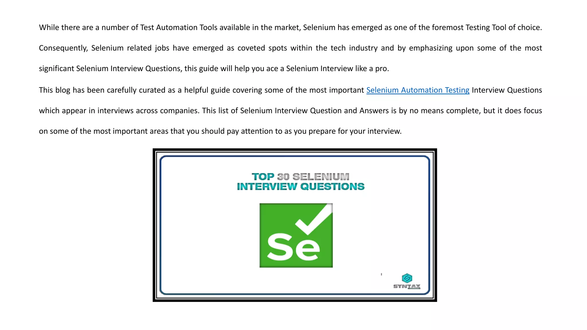 The document outlines the top 30 interview questions for Selenium, a popular test automation tool in the tech industry. It categorizes the questions into basic, intermediate, and advanced levels, providing key topics to focus on for interview preparation. Additionally, it highlights the advantages, limitations, and various concepts associated with Selenium, aiding candidates in their interview readiness.