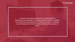 The document outlines the top five in-demand web development frameworks for 2023, including React, Vue.js, Angular, Django, and Ruby on Rails. It provides a brief description of each framework's unique features and advantages, highlighting their popularity among developers. Additionally, the document mentions Cogniter Technologies as an offshore web development company that utilizes these frameworks to deliver scalable solutions.