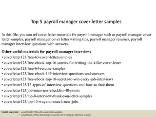 This document provides resources for writing a payroll manager cover letter and preparing for a payroll manager interview. It lists top cover letter samples, cover letter writing tips, resume samples, and interview questions and answers. It also includes links to additional free resources on cover letters, resumes, interview questions, dress codes, written tests, closing statements, and case study examples to help candidates applying for payroll manager positions.