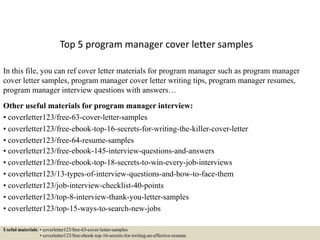 The document provides resources for a program manager job search, including cover letter samples, resume examples, and interview preparation materials. It lists over a dozen links to sites with free downloadable guides, templates, and samples for cover letters, resumes, and answering common interview questions. The links cover topics such as writing cover letters, resumes, preparing for different types of interviews, asking employers effective questions, negotiating salary, and more.