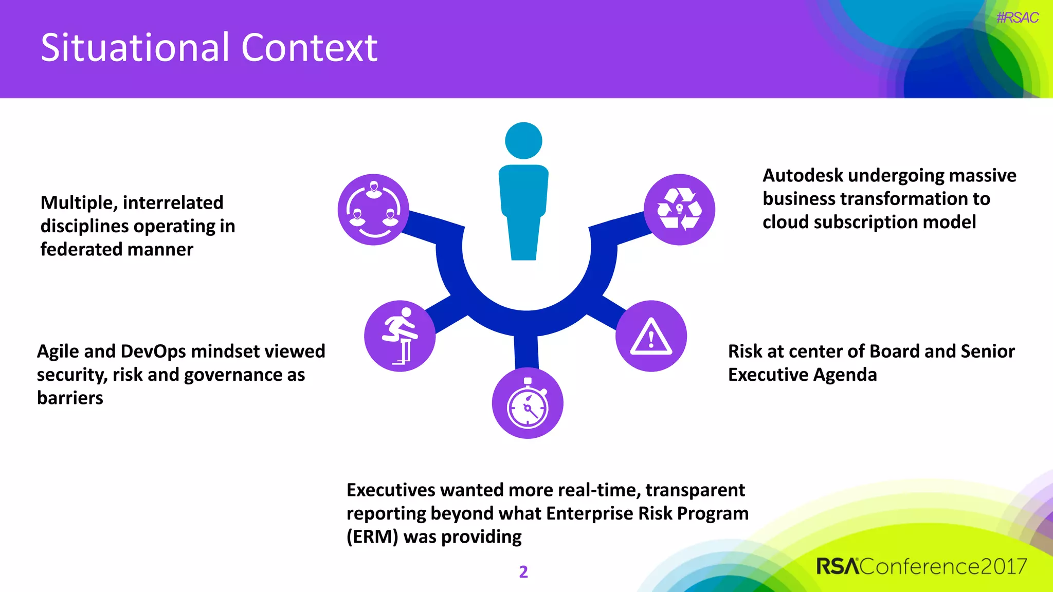 The document outlines the strategies and lessons learned by Autodesk in jumpstarting their cyber-risk program amidst a business transformation to a cloud-based model. It emphasizes a holistic approach to cybersecurity through five key secrets: taking a comprehensive view, prioritizing strategy, adopting an agile mindset, fostering a risk management culture, and using risk for decision-making. The approach aims to enhance communication of the organization's risk posture and align all stakeholders towards common objectives in an efficient manner.