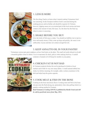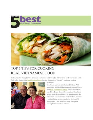 The document provides 5 tips for cooking authentic Vietnamese food from chef Tracey Lister, who is famous for teaching Vietnamese cuisine. The tips are: 1) Vietnamese food relies on dipping sauces for seasoning rather than seasoning during cooking; 2) when buying fish sauce, it should bubble slowly rather than quickly; 3) annatto oil adds color and flavor and keeps well; 4) chicken fat can be used like butter or cream to add moisture; and 5) cooking meat and fish on the bone retains moisture and maximizes flavor.