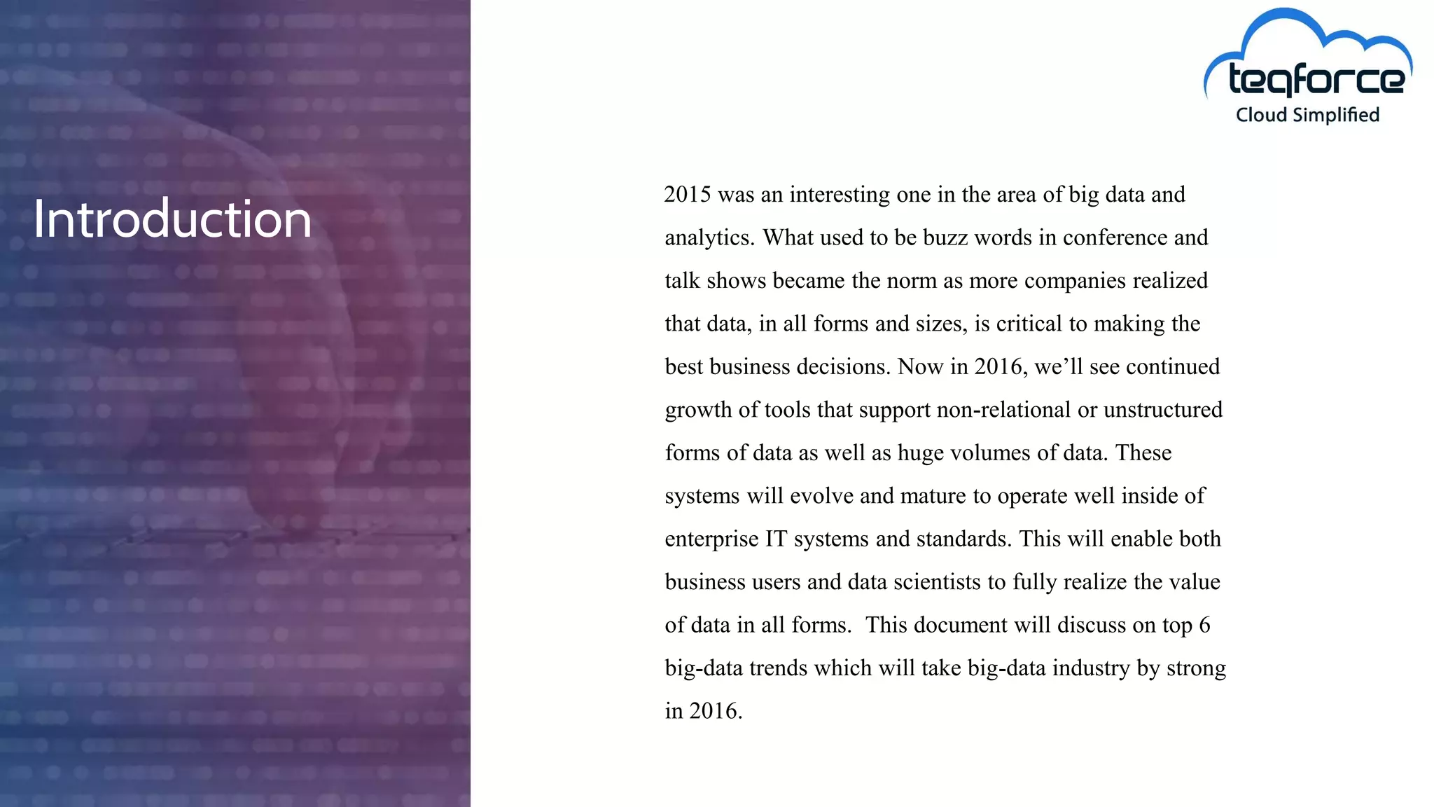 This document discusses the top 5 trends in big data and analytics for 2016. It notes that in 2015, big data became more mainstream as companies realized the importance of all types of data for decision making. Going forward, tools that support unstructured and huge volumes of data will continue growing and integrate better with existing IT systems. The trends discussed are: increased adoption of NoSQL databases in enterprises; rapid growth of Apache Spark usage; continued movement of Hadoop implementations from proofs-of-concept to production; maturation of Hadoop implementations; and growth of cloud-based data warehousing with increased competition among vendors.
