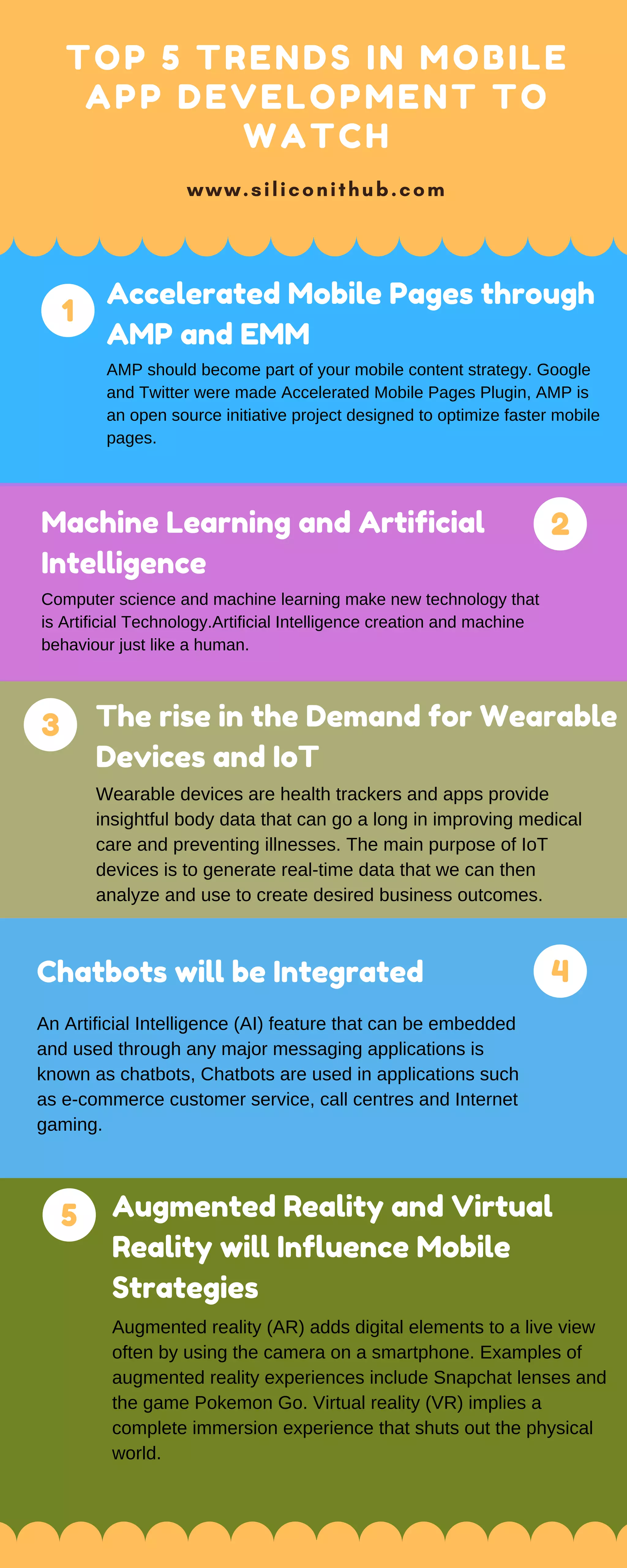 The document discusses the top five trends in mobile app development, emphasizing the significance of Accelerated Mobile Pages (AMP) for faster content delivery. It highlights the impact of artificial intelligence, machine learning, wearables, and Internet of Things (IoT) devices on health and business outcomes. Additionally, it explores the integration of chatbots and the influence of augmented and virtual reality on mobile strategies.