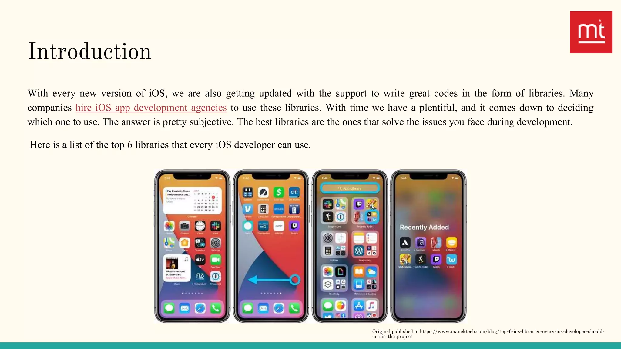The document outlines the top six iOS libraries that every iOS developer should consider using, including Alamofire for networking, AFNetworking for easier URL session handling, and ObjectMapper for JSON data mapping. Additionally, it mentions SDWebImage for asynchronous image downloading, SwiftyJSON for better JSON data handling, and MBProgressHUD for managing UI loading indicators. The article emphasizes the importance of choosing libraries that address specific development challenges to enhance the application development process.