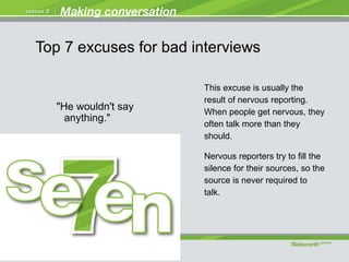 This document provides tips to address common excuses for bad interviews. It discusses excuses such as the source not providing many quotes, the interviewer losing their questions, sources talking too fast or on stupid topics, and the interviewer not being well prepared. The document recommends preparing well in advance with a list of open-ended questions, practicing interviews, asking sources for feedback, and viewing interviews as conversations to get more information.