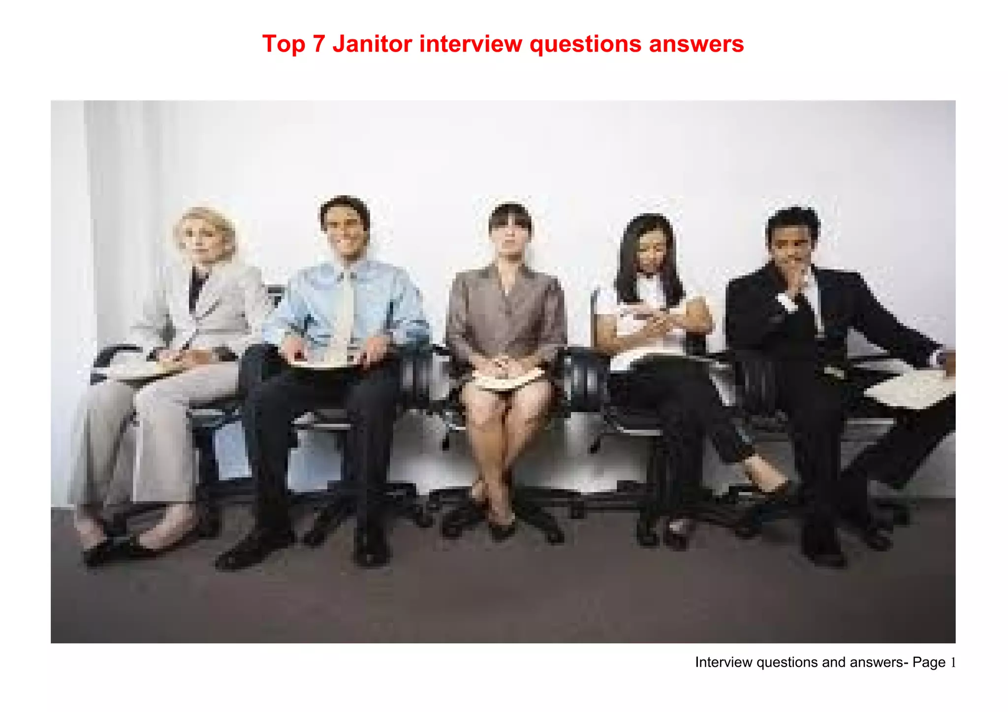 This document provides tips and sample answers for common janitor interview questions. It discusses how to answer questions about yourself, your strengths, career goals, reasons for leaving previous jobs, weaknesses, knowledge of the organization, and ways you've improved your skills in the last year. For each question, it offers steps and guidelines to provide well-prepared, positive responses that highlight your relevant qualifications and experience. Sample answers are given as examples of effective ways to respond to help land the janitor position.